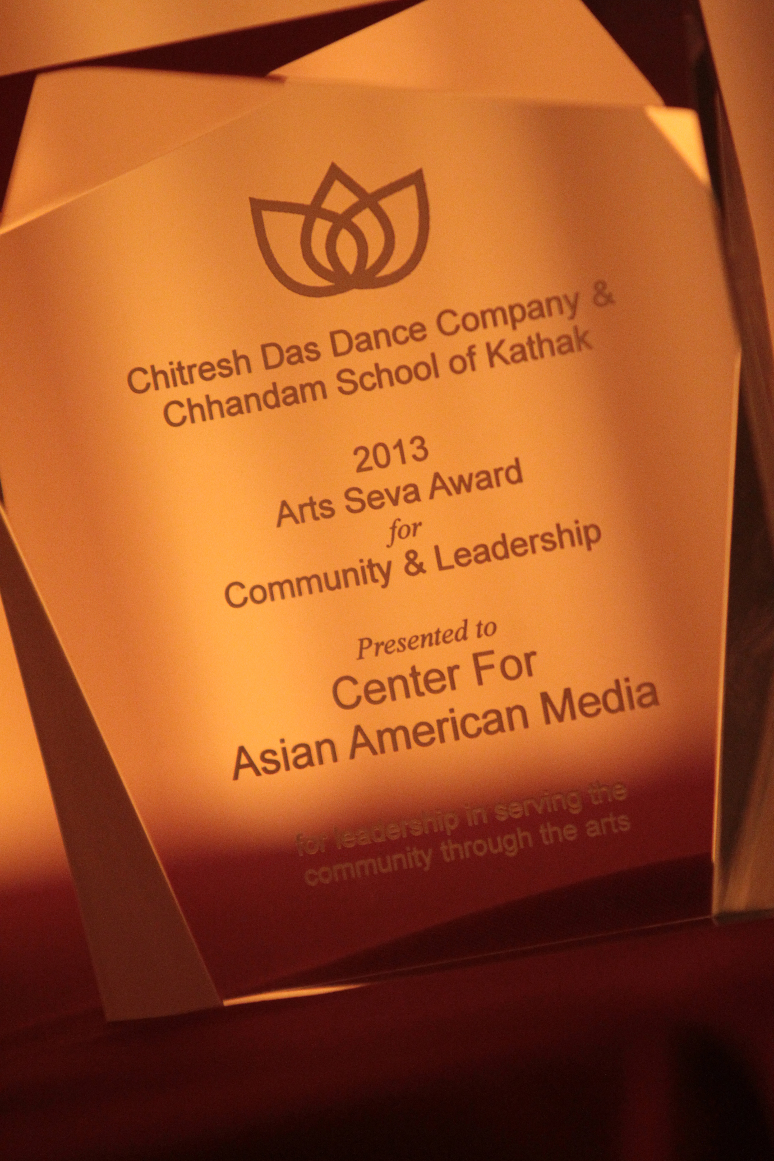 On Saturday, March 2nd, during Chitresh Das Dance Company (CDDC) and Chhandam School of Kathak’s (Chhandam) annual CDDC / Chhandam’s 2013 Arts Seva Award. The CDDC/ Chhandam bestows the Arts Seva Award to an individual, organization, or business that has significantly impacted the arts and CDDC/Chhandam’s work. The gala also featured the premiere of the documentary film UPAJ: IMPROVISE, which CAAM helped produce in association with Hindipendent Films. CAAM was selected for the award, in part because of our support of the project. UPAJ: IMPROVISE sheds light on the artistic collaboration between Pandit Das and Jason Samuels Smith as part of their efforts to preserve classical Indian cultural arts traditions for the broader community. CAAM Associate Director Kar Yin Tham accepted the award on behalf of CAAM.