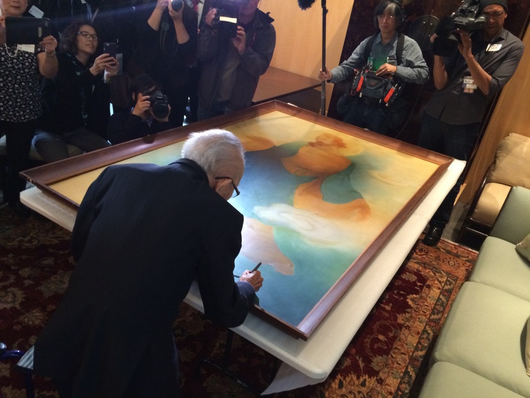 On Wednesday afternoon, Wong arrived at the Asian Art Museum, his large-scale Jesus painting displayed in a room where San Francisco Supervisor Eric Mar presented him with a proclamation: March 9, 2016 was declared “Tyrus Wong Day” in San Francisco. “[Tyrus Wong’s] gift of creating a feeling and emotion in his art is what captured Walt Disney’s attention, and he unknowingly transformed the look and feel of animation for the film Bambi,” said Michael Labrie, Director of Collections and Exhibitions at the Walt Disney Family Foundation, who spoke at the signing on Wednesday.