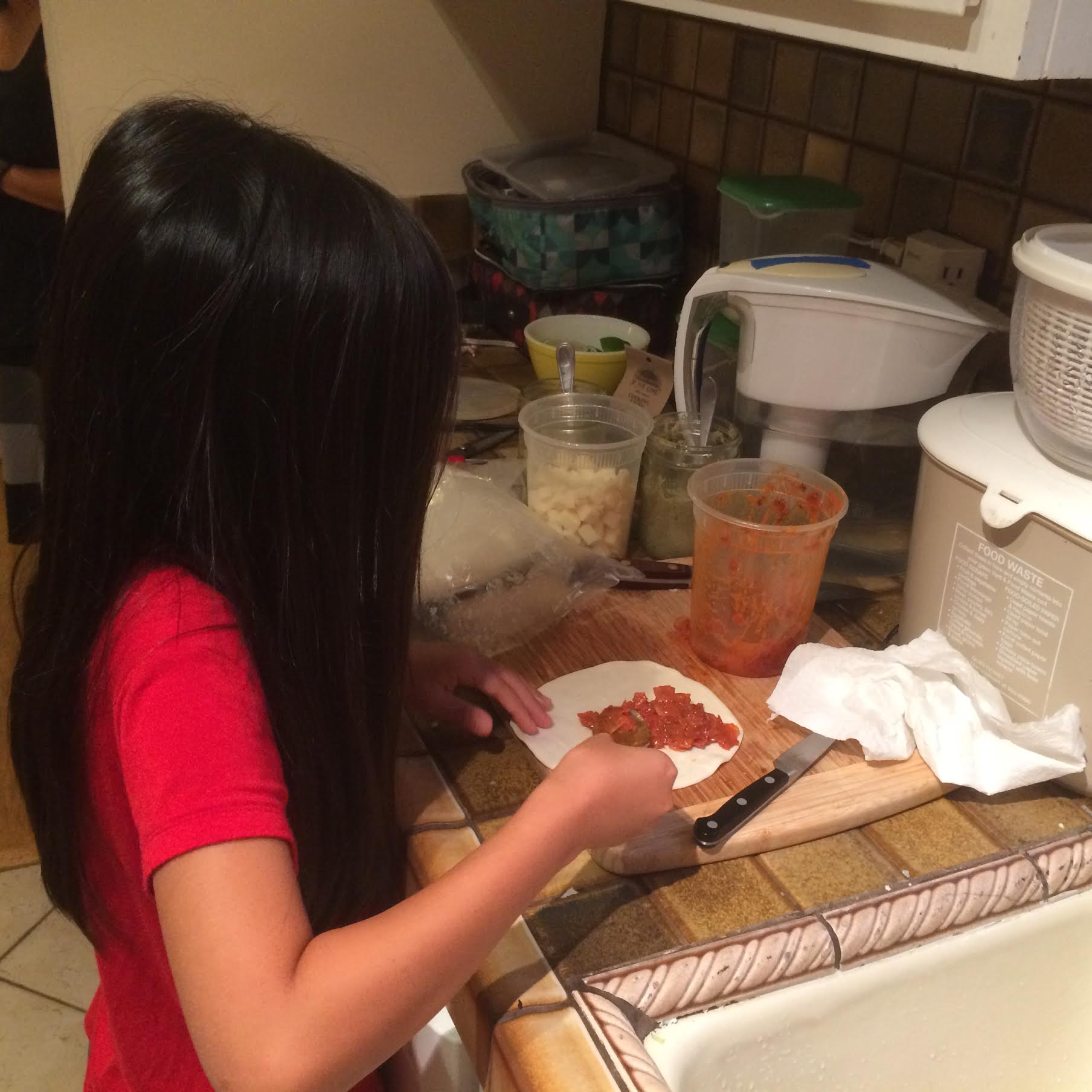 Leonard started us off with the two dishes, including the amuse-bouche at Talde’s eponymous restaurant in Brooklyn: bacon-tamarind caramel wrapped in a perilla leaf. He also enlisted the kids in the house to help him prep what amounted to roti pizza pockets, made with frozen roti, cubed mozzarella and Talde’s pepperoni marinara sauce. Once those came hot out the oven, we dug into both.