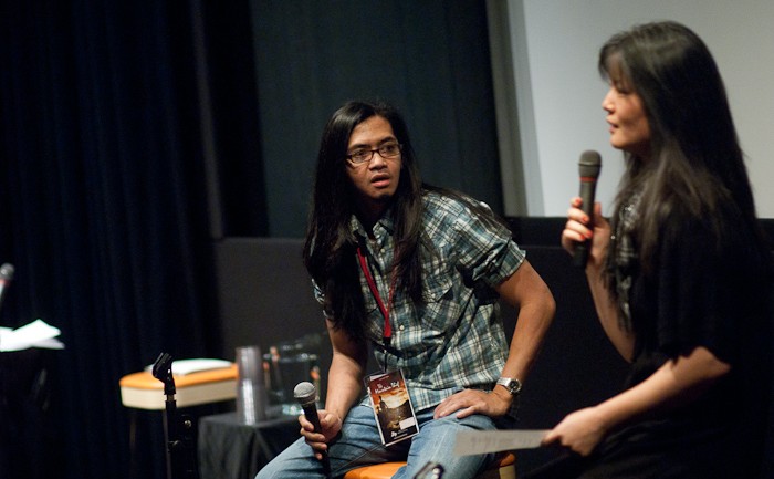 Filmmaker Gerry Balasta and independent producer Karin Chien during a CAAM Fellowship panel.