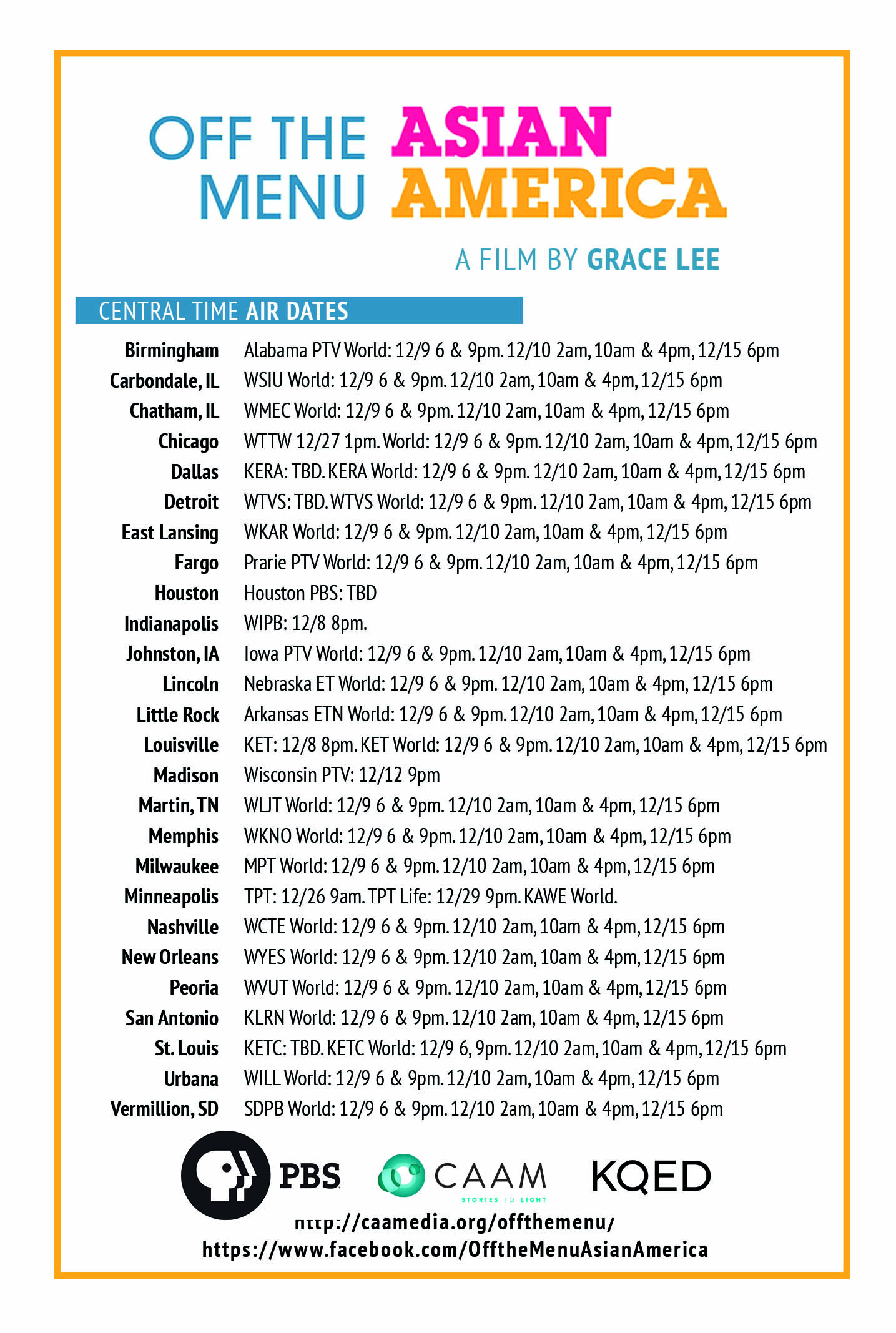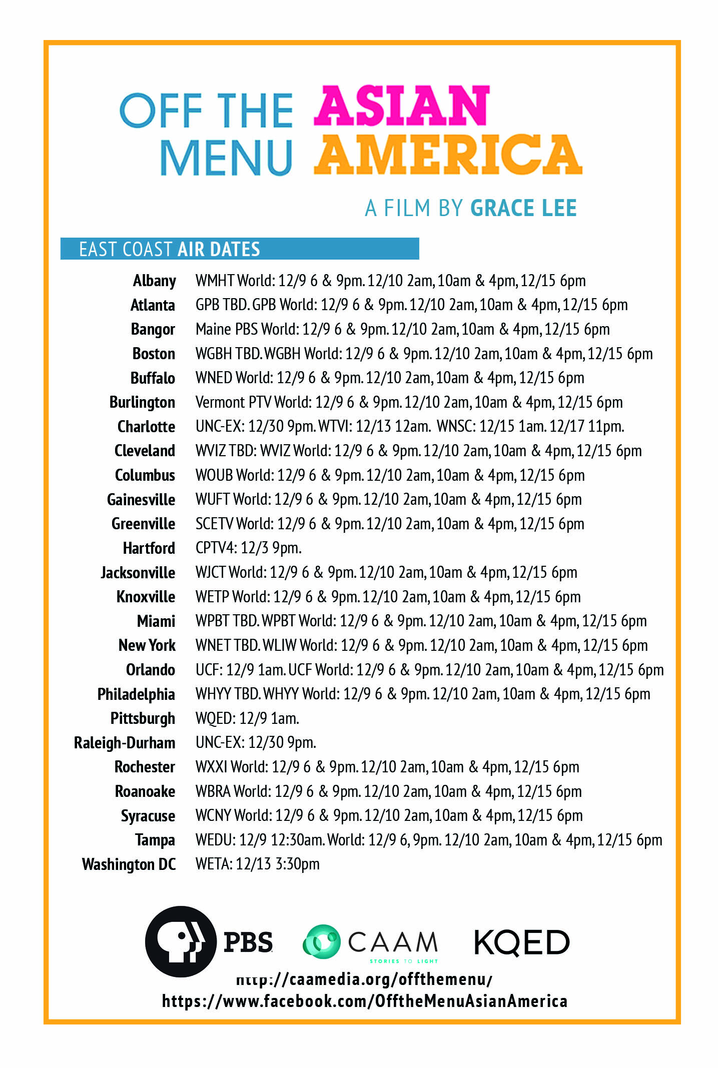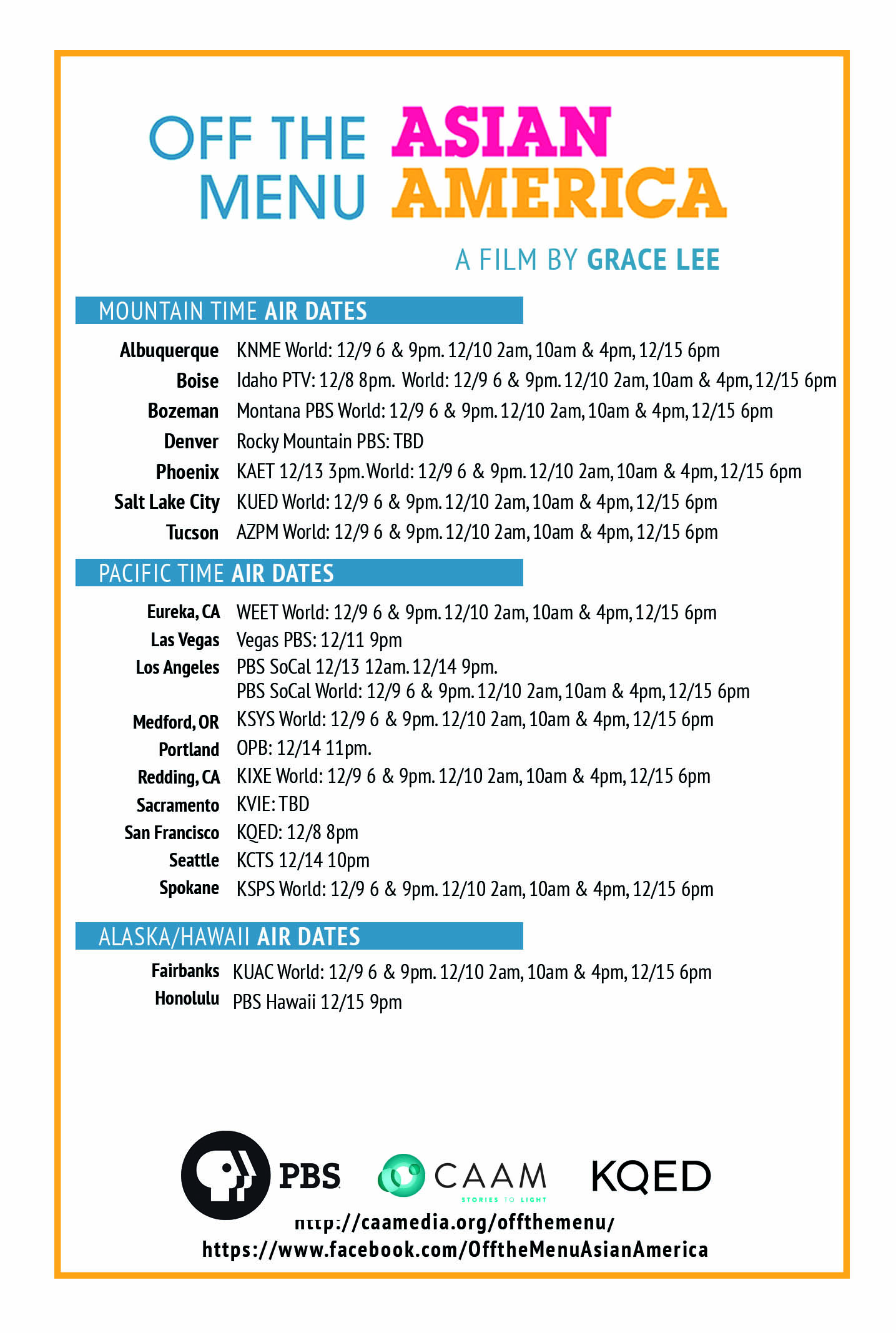 Tune in for Grace Lee’s newest documentary, Off the Menu: Asian America, premiering this week on PBS! Broadcast begins December 8. Download the TV schedule here or check your local PBS station for specific times and airdates.